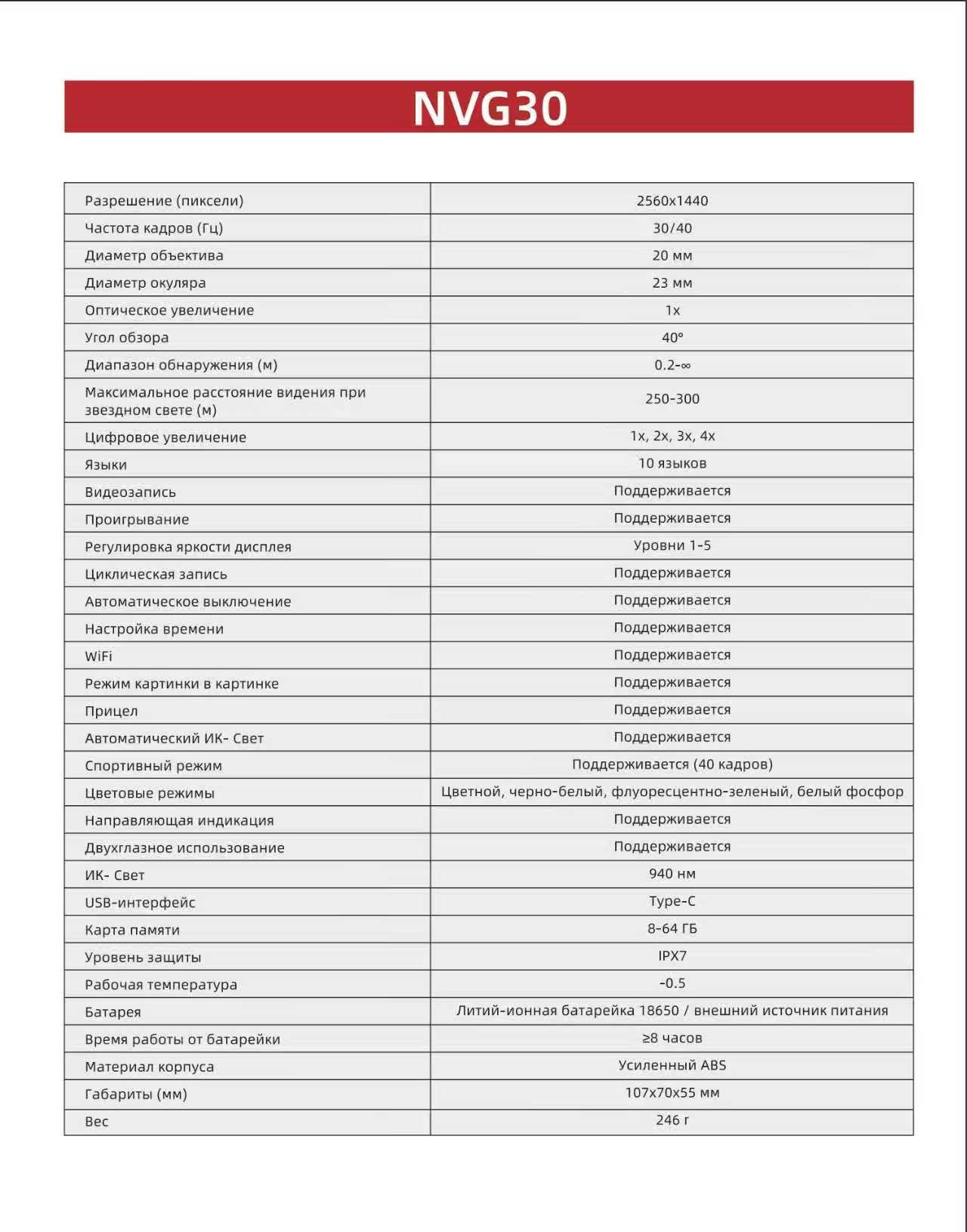 NVG30 оснащений вбудованим модулем Wi-Fi, який дозволяє передавати зображення в реальному часі на мобільні пристрої, записувати відео зі звуком і фотографії, переглядати матеріали та використовувати функцію «картинка в картинці». На екрані відображаються індикатори заряду батареї, часу, режиму підсвічування, стану Wi-Fi і цифровий компас.