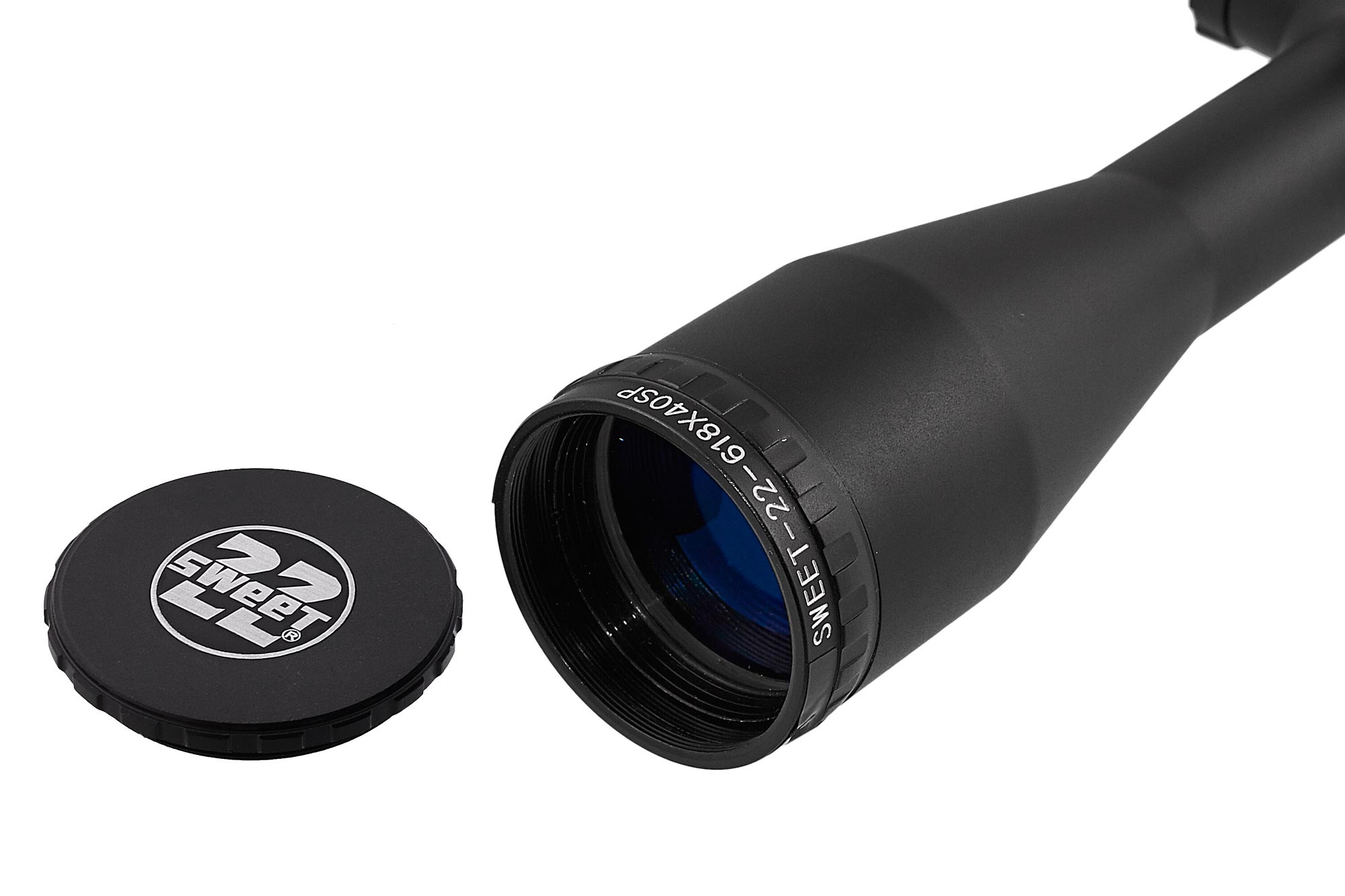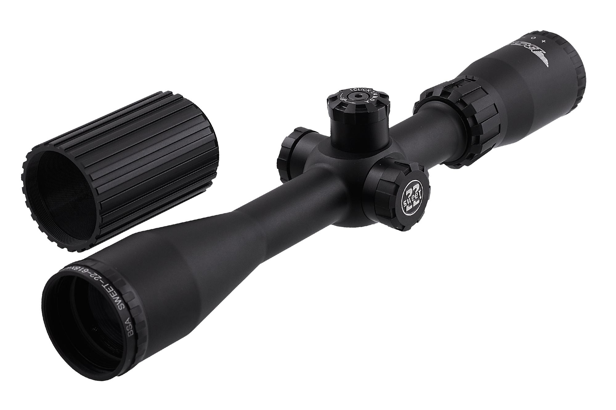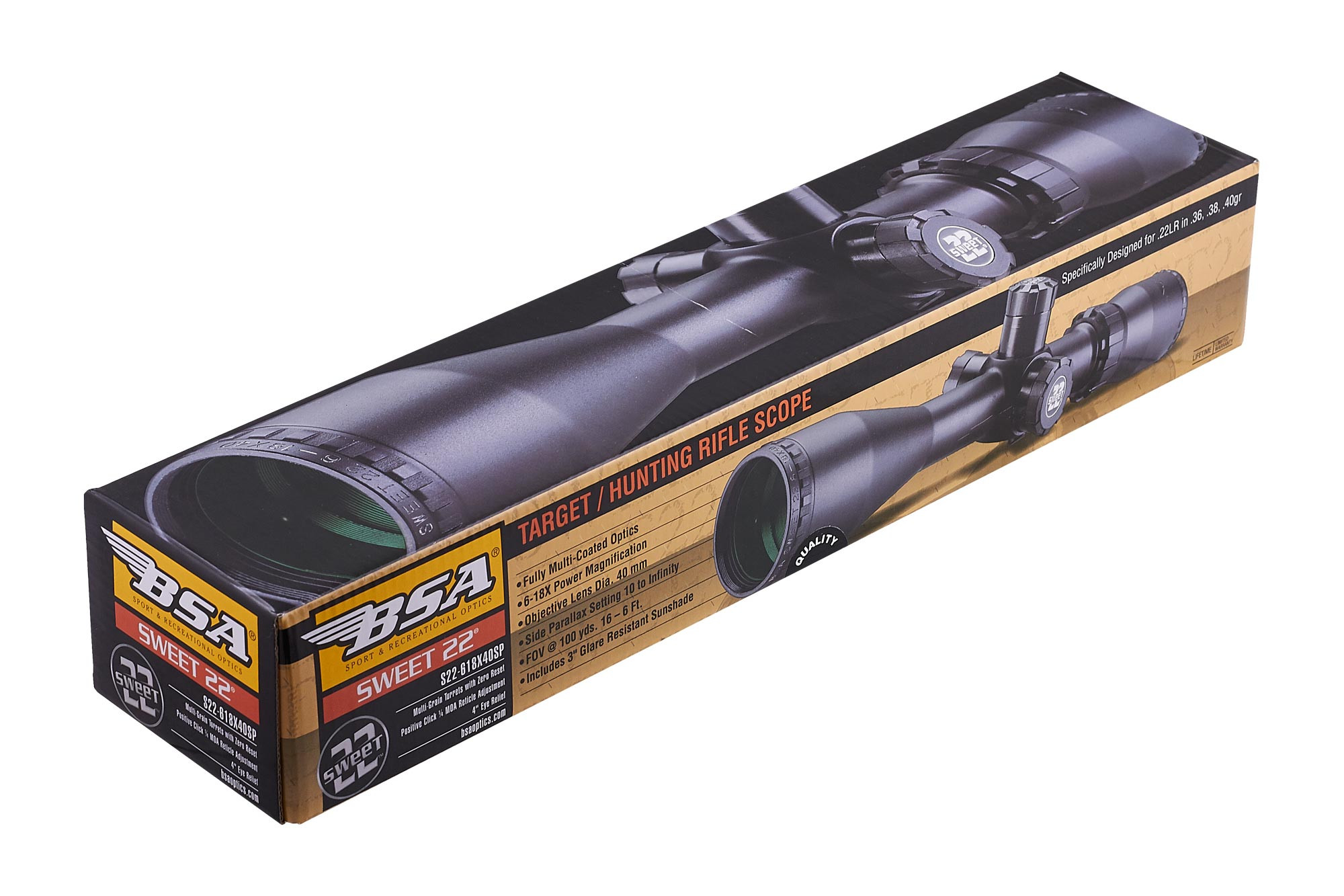 6-18x40 SP-BSA SWEET 22 - оптический прицел с изменяемой в пределах 6-18 раз кратностью. Он совместим с пневматикой CO2, пневматикой РСР, огнестрельным оружием (скорость пули до 350м/с), арбалетами. Как утверждает производитель, данная модель создавалась в первую очередь для применения с оружием под патрон .22 LR. Например, в систему внесения поправок внесён ряд дополнительных изменений (о которых ниже).