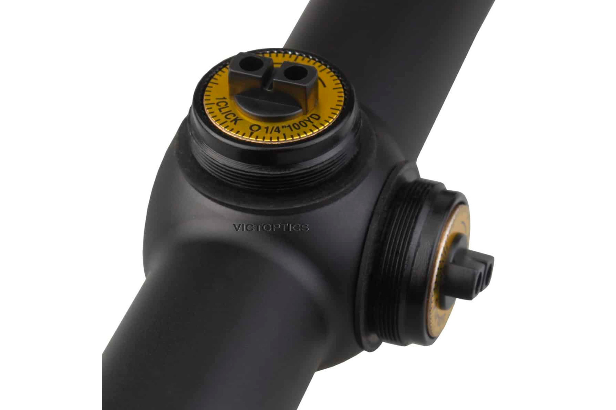 Внесение поправок производится барабанчиками скрытыми на корпусе прицела под защитными крышками. Настройка возможна без применения вспомогательного инструмента. Цена поправки (1 клика) – 0.75 см (1/4 МОА) на 100 ярдах (примерно 91 метр). Запас поправок по высоте и горизонту составляет 60 МОА.
