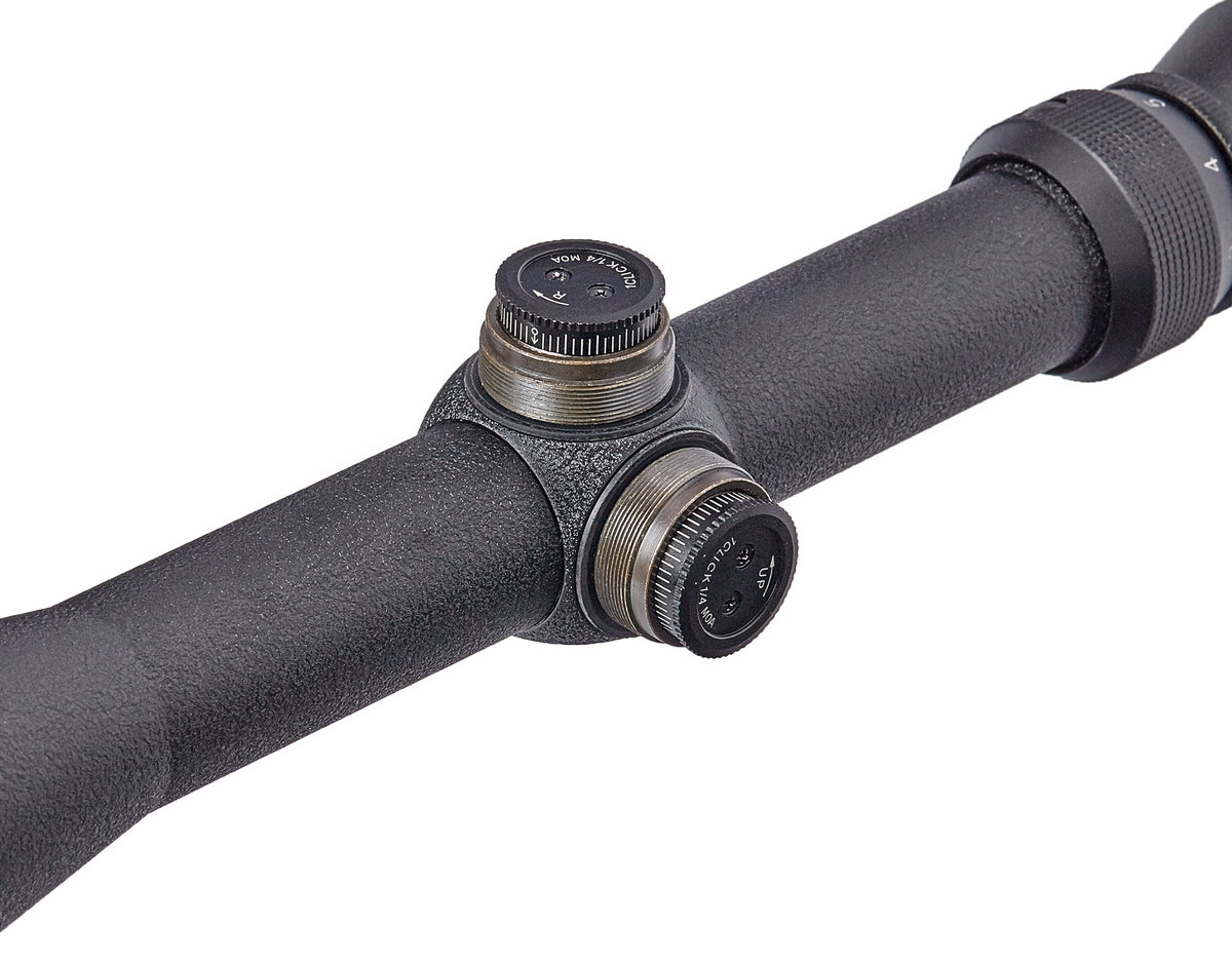 Прицел выполнен в ударопрочном, герметичном корпусе из алюминиевого сплава. Оснащен удобными в использовании пристрелочными барабанчиками с ценой клика 1/4 MOA невысокого профиля. Маховики барабанчиков прячутся под металлическими защитными крышечками, закручивающимися по резьбе.