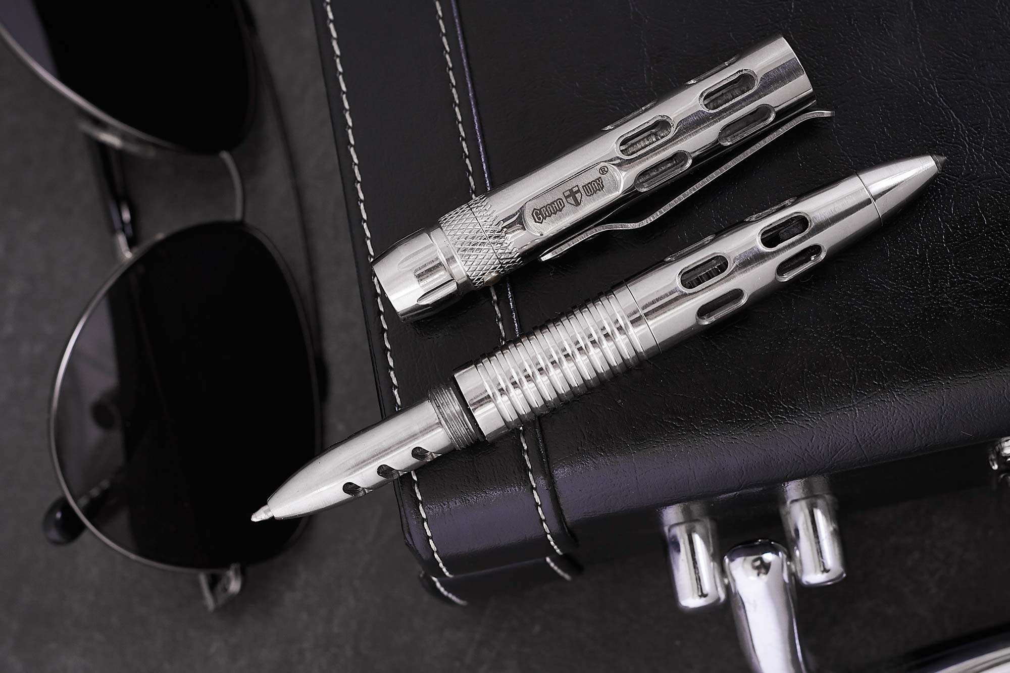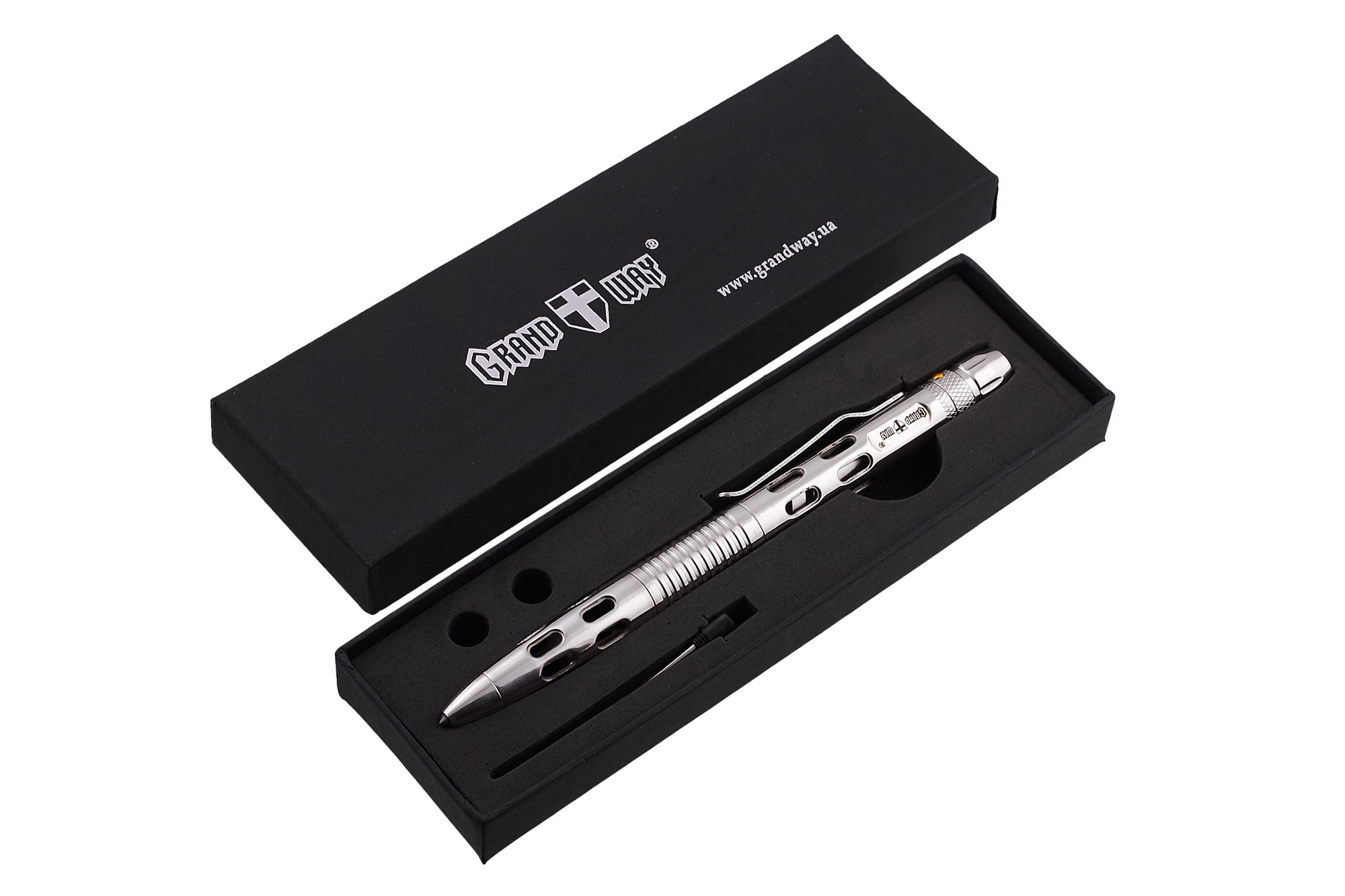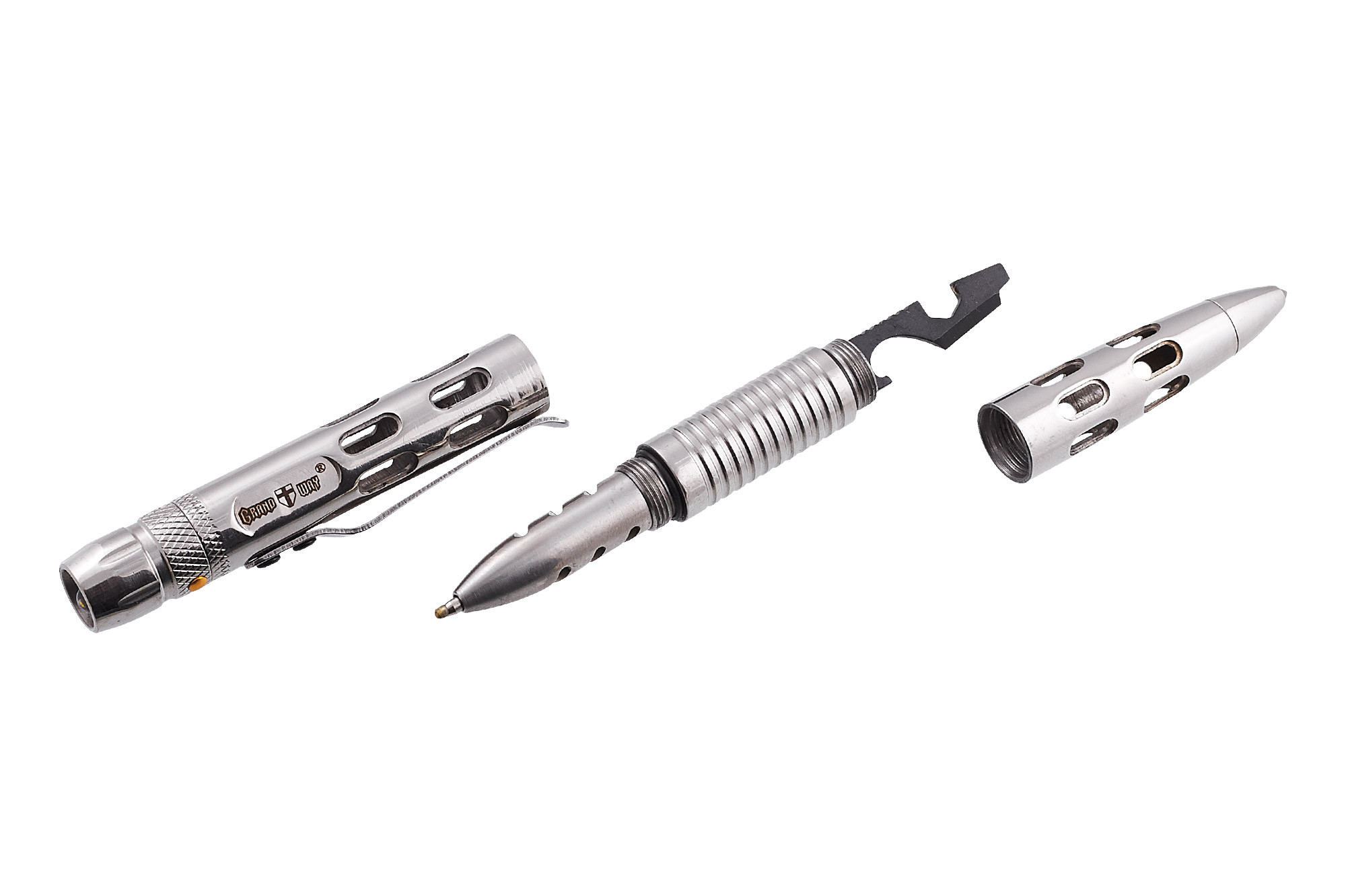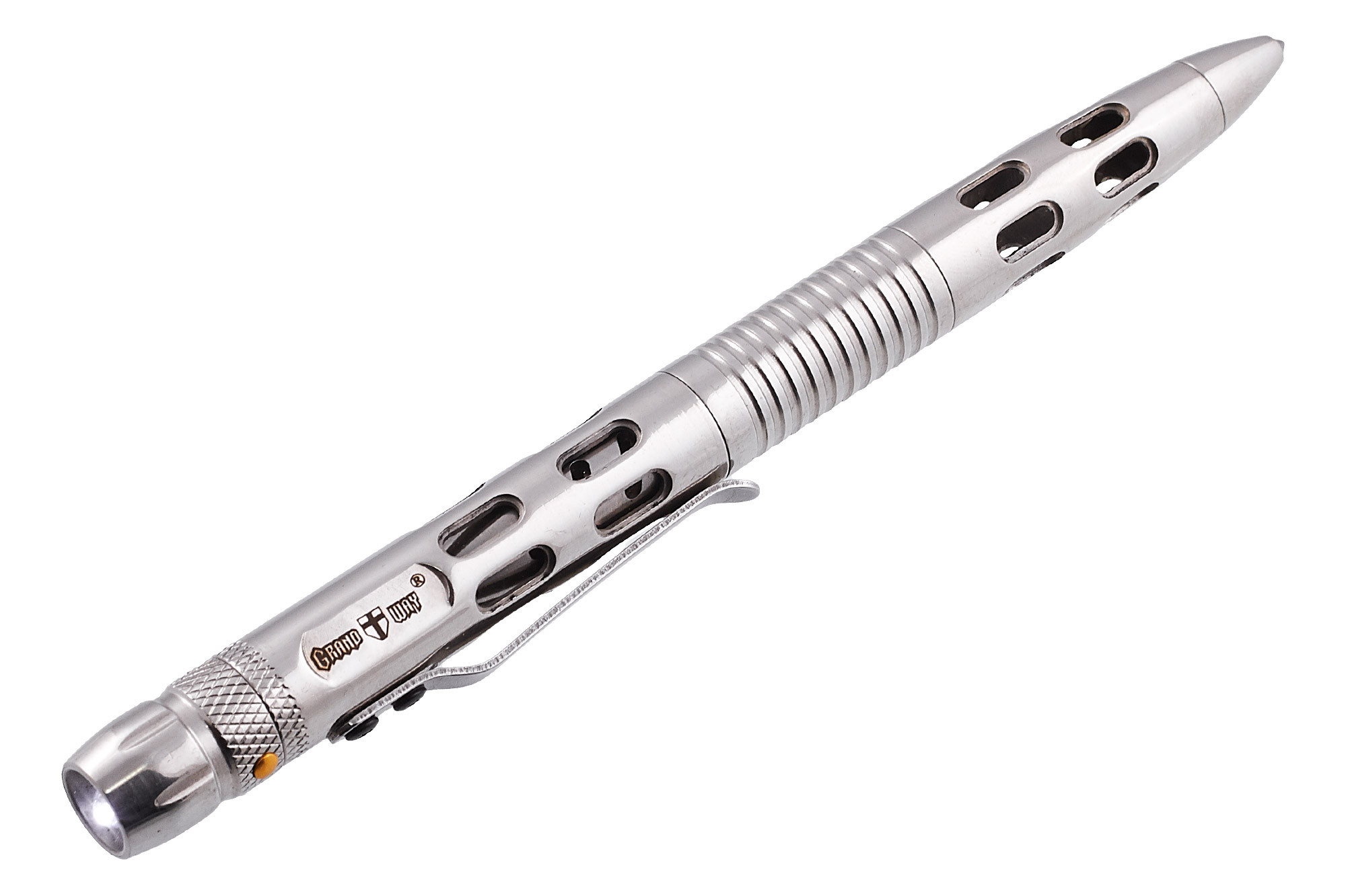 Тактическая ручка Grand Way 33082 – это надежная письменная принадлежность в устойчивом к нагрузкам цельнометаллическом корпусе, имеющая также в своем арсенале дополнительные встроенные функции: