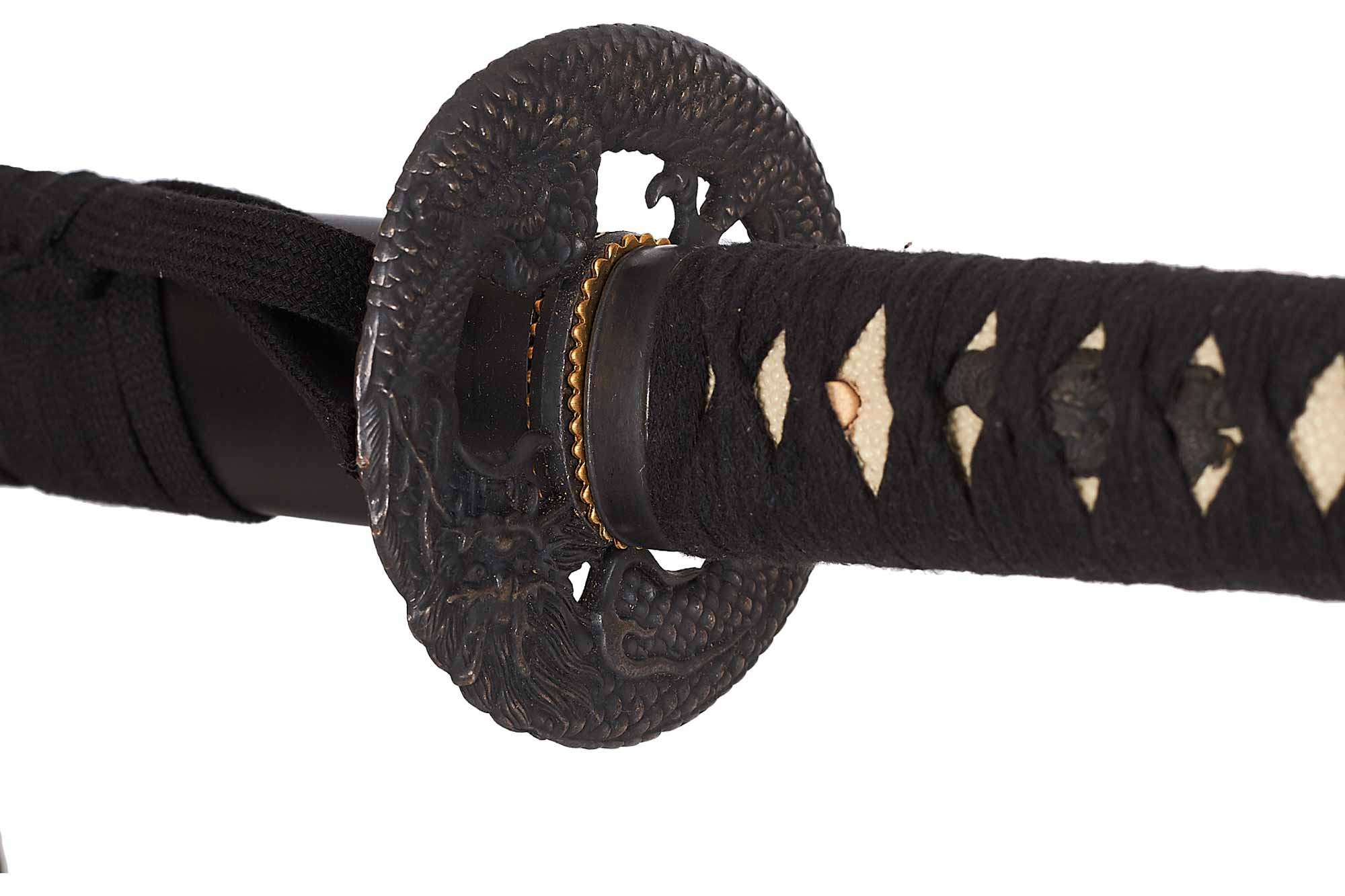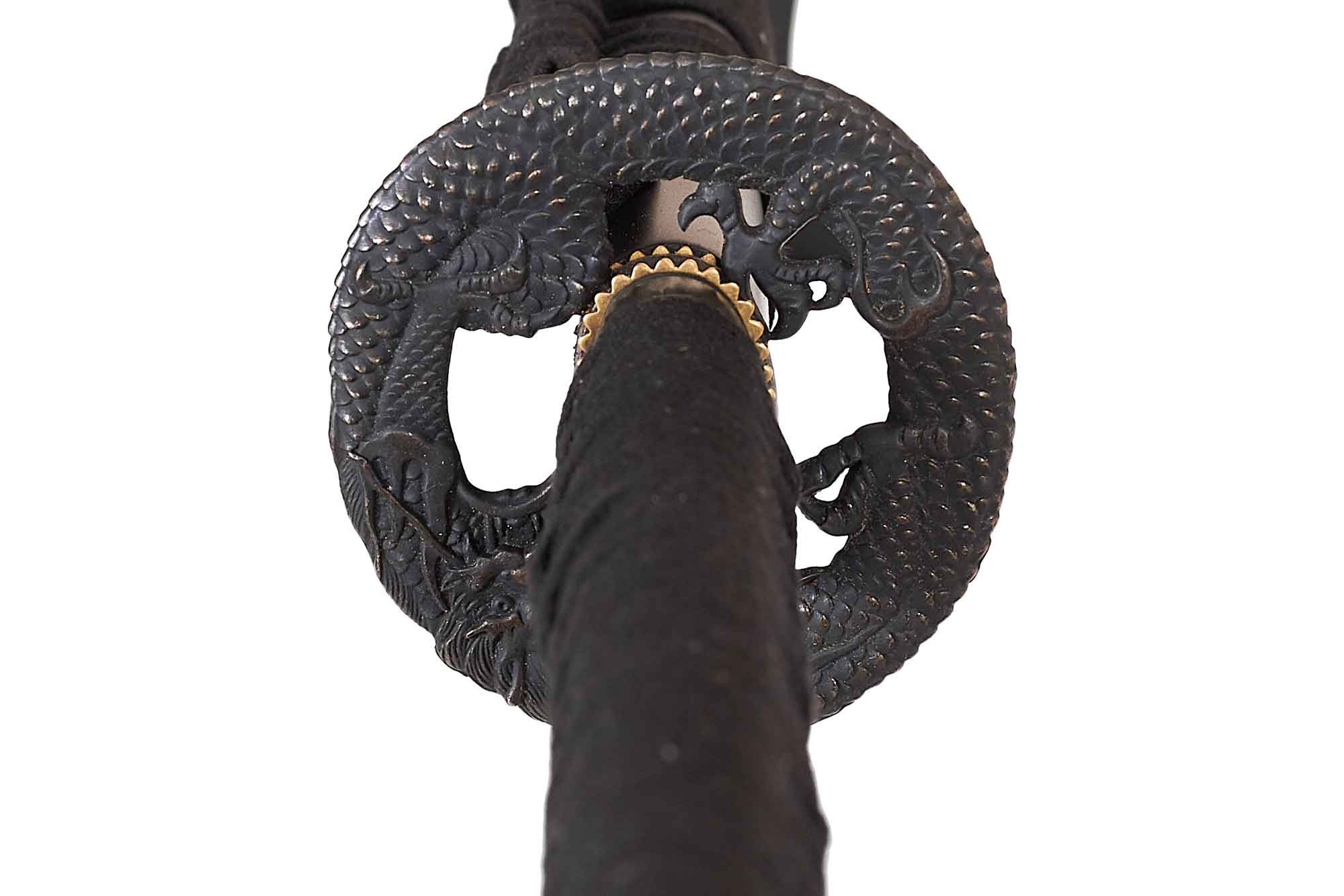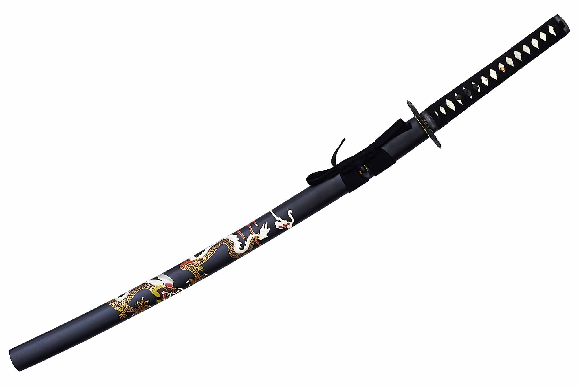 Реплика 15952 выполнена с большим вниманием к деталям и особенностям конструкции настоящих японских мечей. Ножны (сая) украшены изображением восточного дракона (символа мудрости, мощи и мужества). Сагэо (шнур для крепления сая) и цука-ито (оплётка рукояти) выполнены чёрными, в цвет ножен. Гарда меча (цуба) также несёт декоративное изображение дракона, что придаёт убранству меча выдержанный, единый стиль.