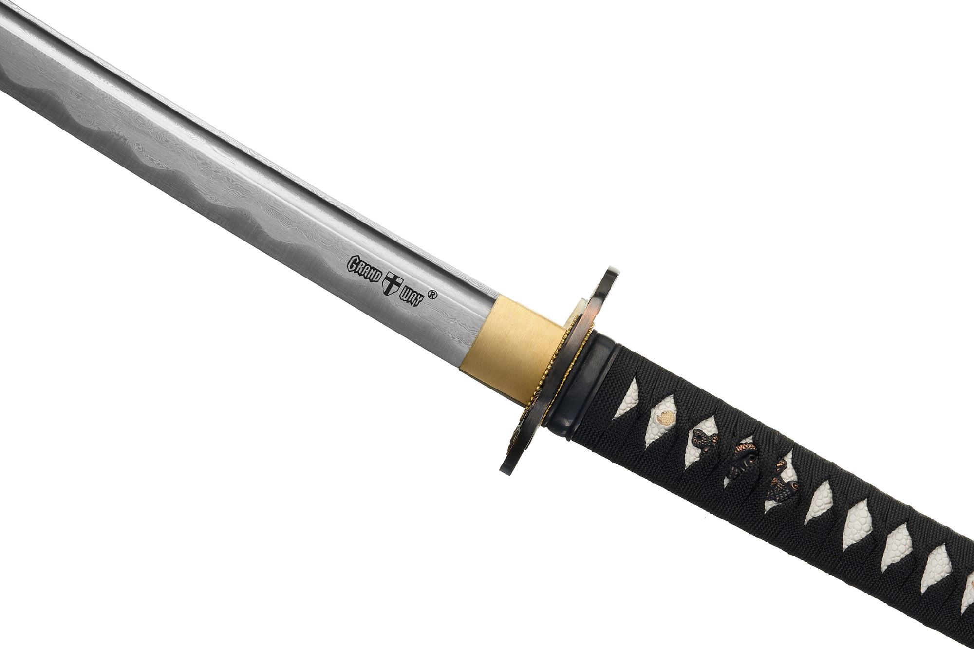 Меч 17905 (KATANA DAMASK) виконаний з великою увагою до деталей та особливостей будови справжньої бойової катани. Піхви (сая), саге (шнур для кріплення сая) та цука-іто (оплітка рукояті) виконані в єдиному стилі. При цьому репліка настільки детальна, що саме (обтяжка рукояті) імітує справжню структуру шкіри ската. Не забуто й таку важливу деталь, як менуке – фігурки під оплеткою рукояті, які служили своєрідними амулетами і дозволяли тактильно визначити положення зброї в руці. Мекуги – штифт, який кріпить ручку до хвостовика клинка, виконаний, як і належить, з дерева.