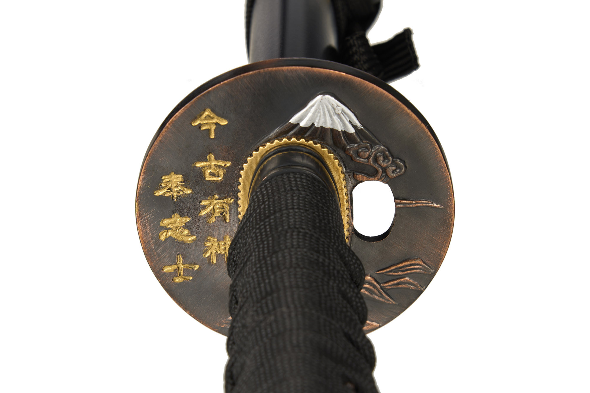 Цуба (гарда меча) відноситься до типу “мару-гата” (круглі цуби) і прикрашена литтям, що зображує священну гору Фудзі та кандзі (японські ієрогліфи) - 今古有神奉志士, що у більш зрозумілому для нас художньому перекладі прозвучить як "З давніх часів і до сьогодні боги з тими, хто живе з гідністю та честю".