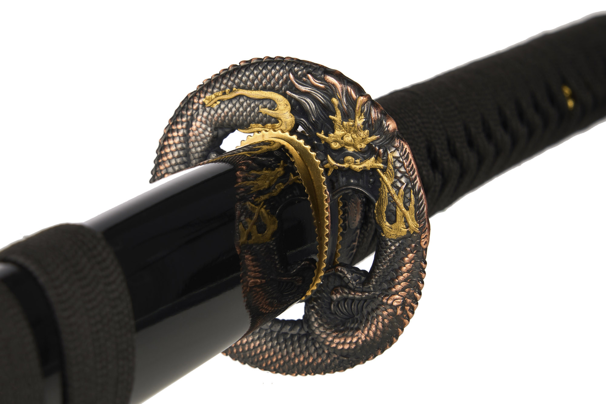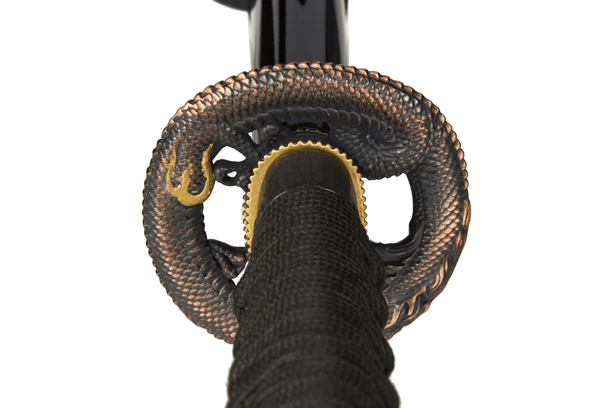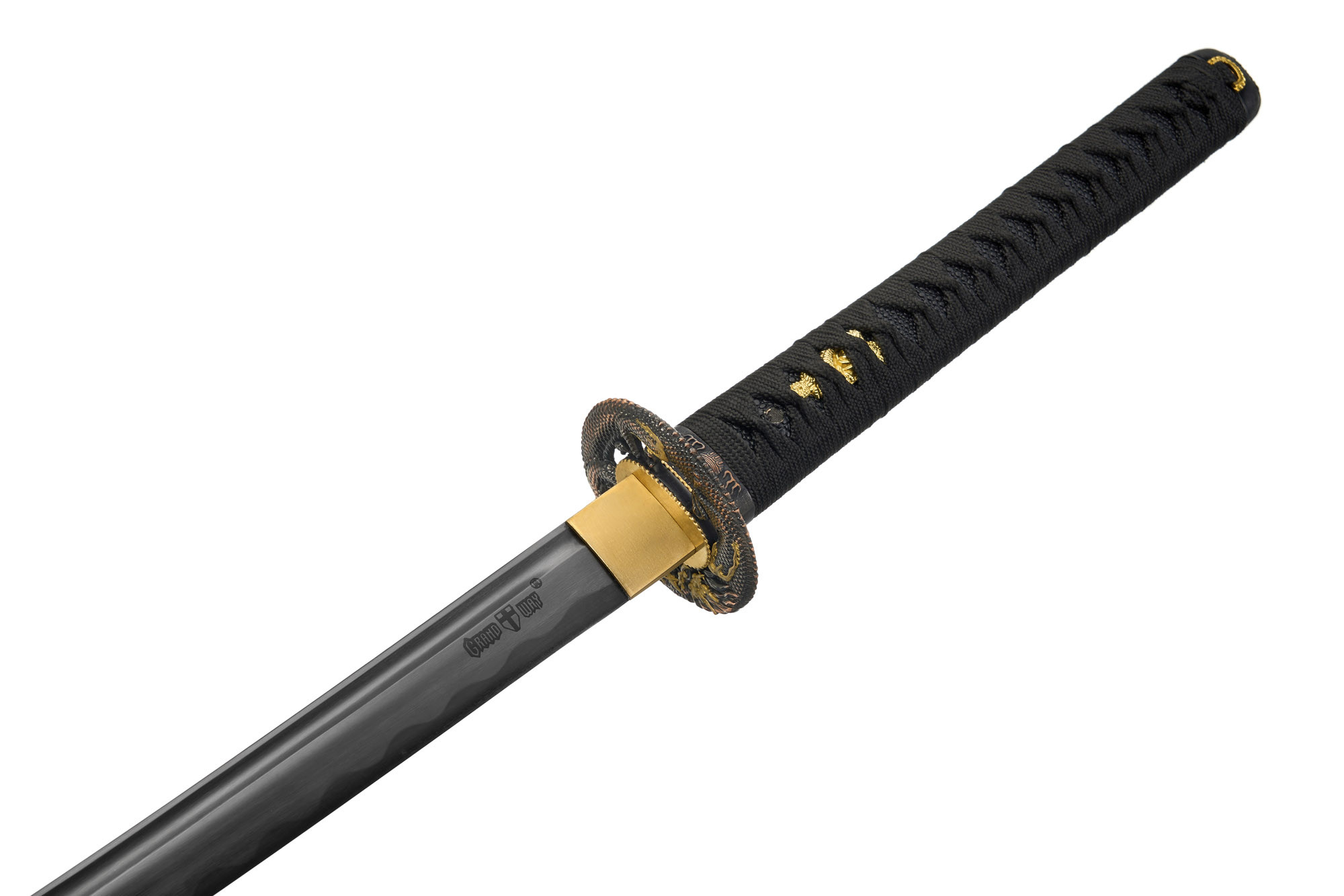 Поверхность клинка стильно анодирована в чёрное антибликовое покрытие. Фурнитура выполнена качественно, с тщательным соблюдением восточного стиля. Меч комплектуется традиционного вида ножнами и красивой подарочной коробкой.