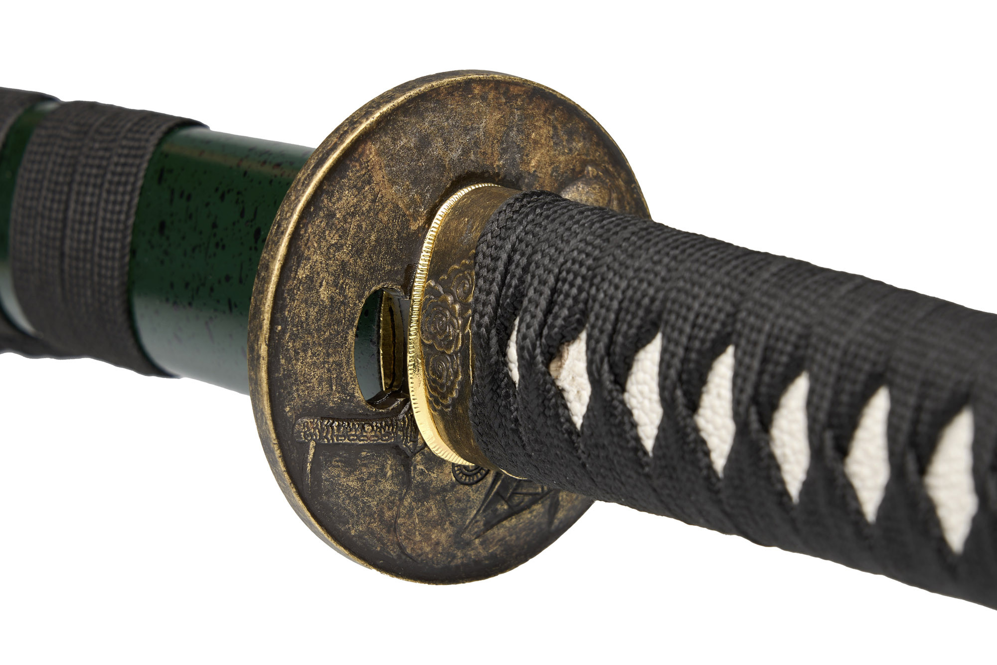 Піхви (сая) виконані у традиційному чорному кольорі. Цука-іто (обплетення руків’я) зроблено якісно та красиво. Наявні навіть такі елементи, як мекуги (дерев’яні штифти, на яких монтується руків’я), менуке (фігурки під оплетенням, які допомагають правильно схопитись за руків’я навпомацки), та імітація обтяжки зі шкіри ската — самегава.