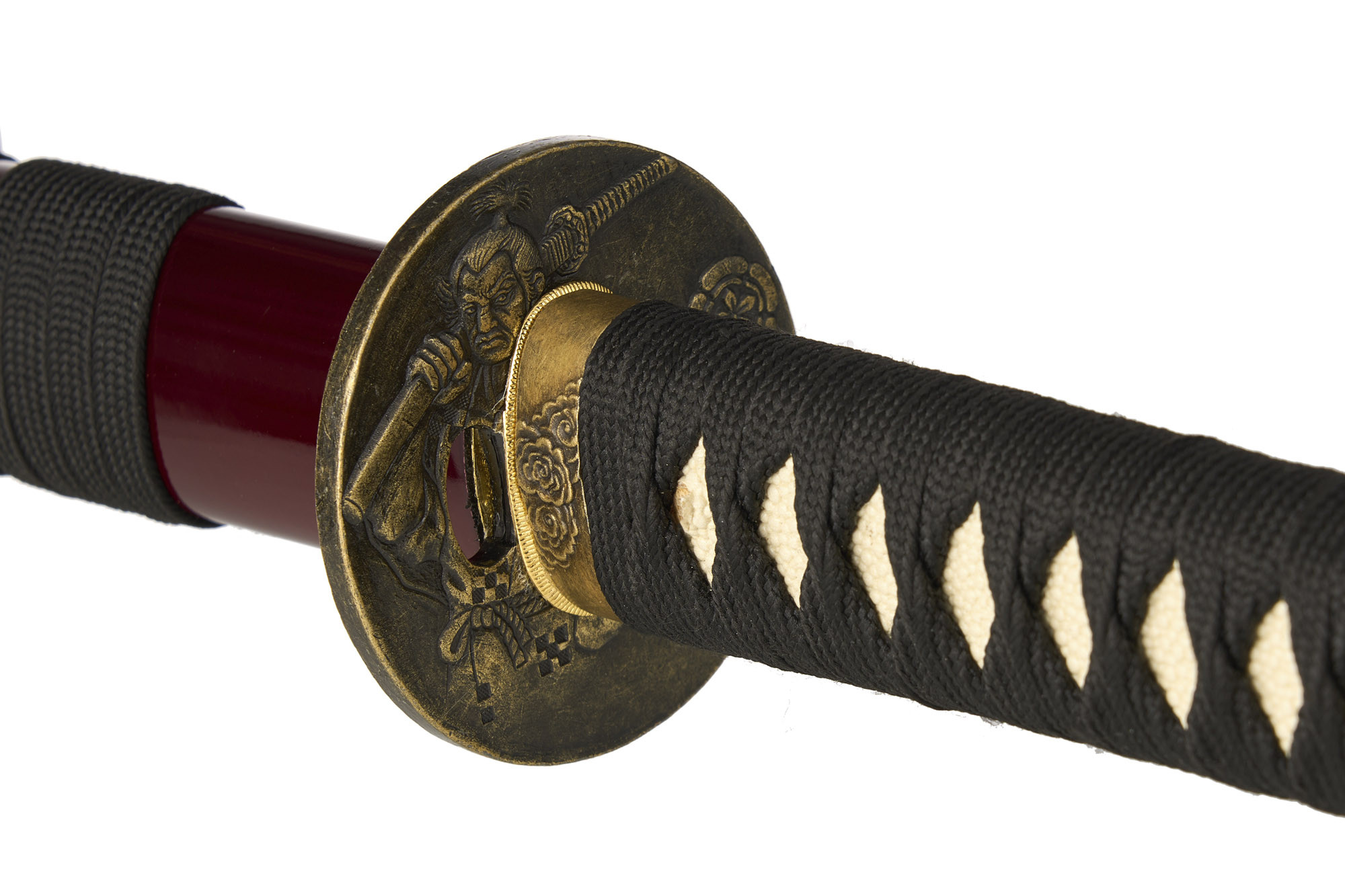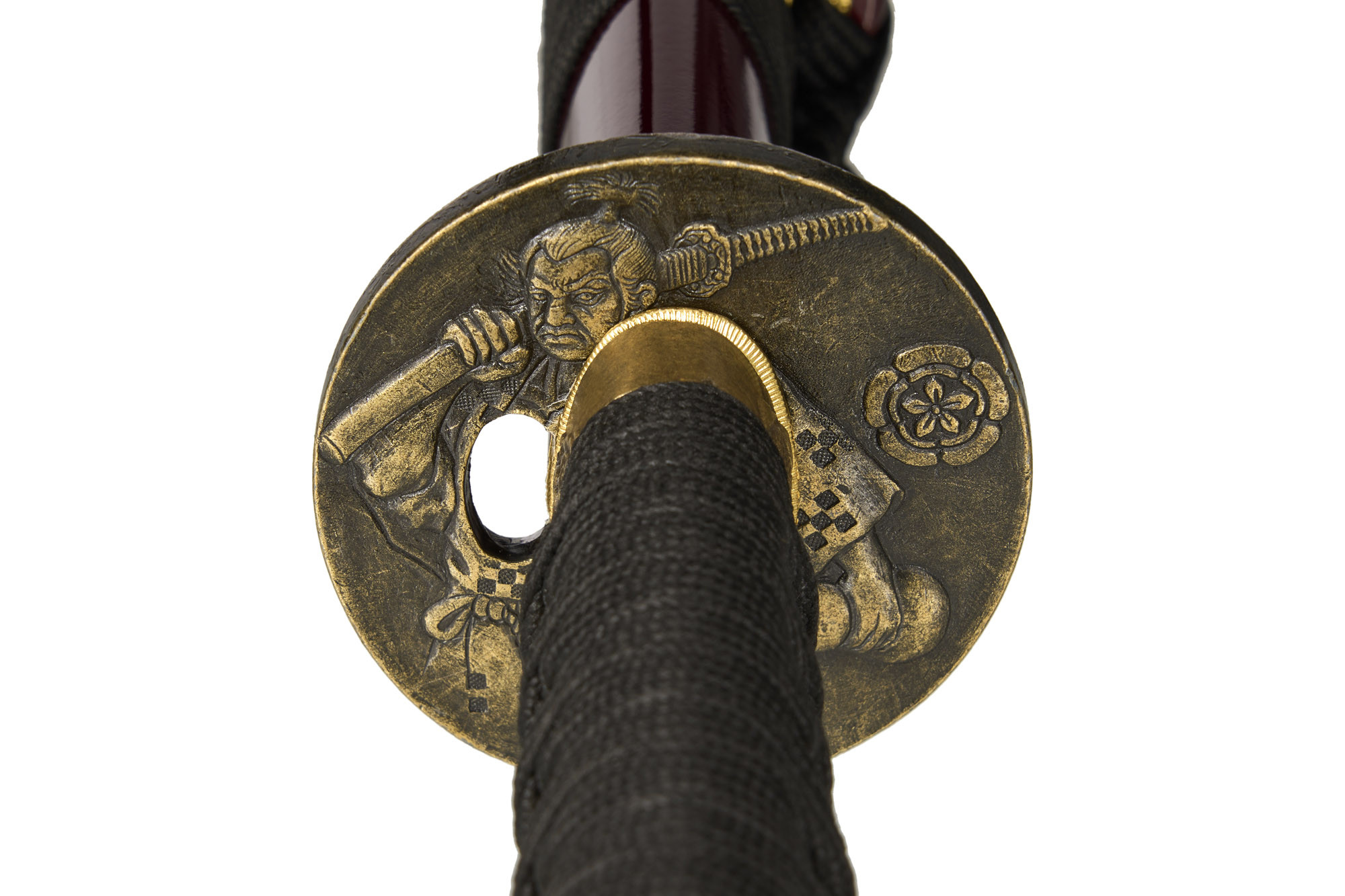 Цуба (гарда меча) відноситься до типу “мару-гата” (круглі цуби). На литих зображеннях, що прикрашають цубу, можна добре розрізнити батальну сцену із часів Сенгоку. Також на цубі ми бачимо зображення фігури воїна-мандрівника. На його одязі добре помітний ишидатами – мон (символ твердості волі, знак священиків). У руці воїна ми бачимо гарбуз-горлянку, що є символом простоти та життєвої сили, з яким часто традиційно зображують ченців та святих.