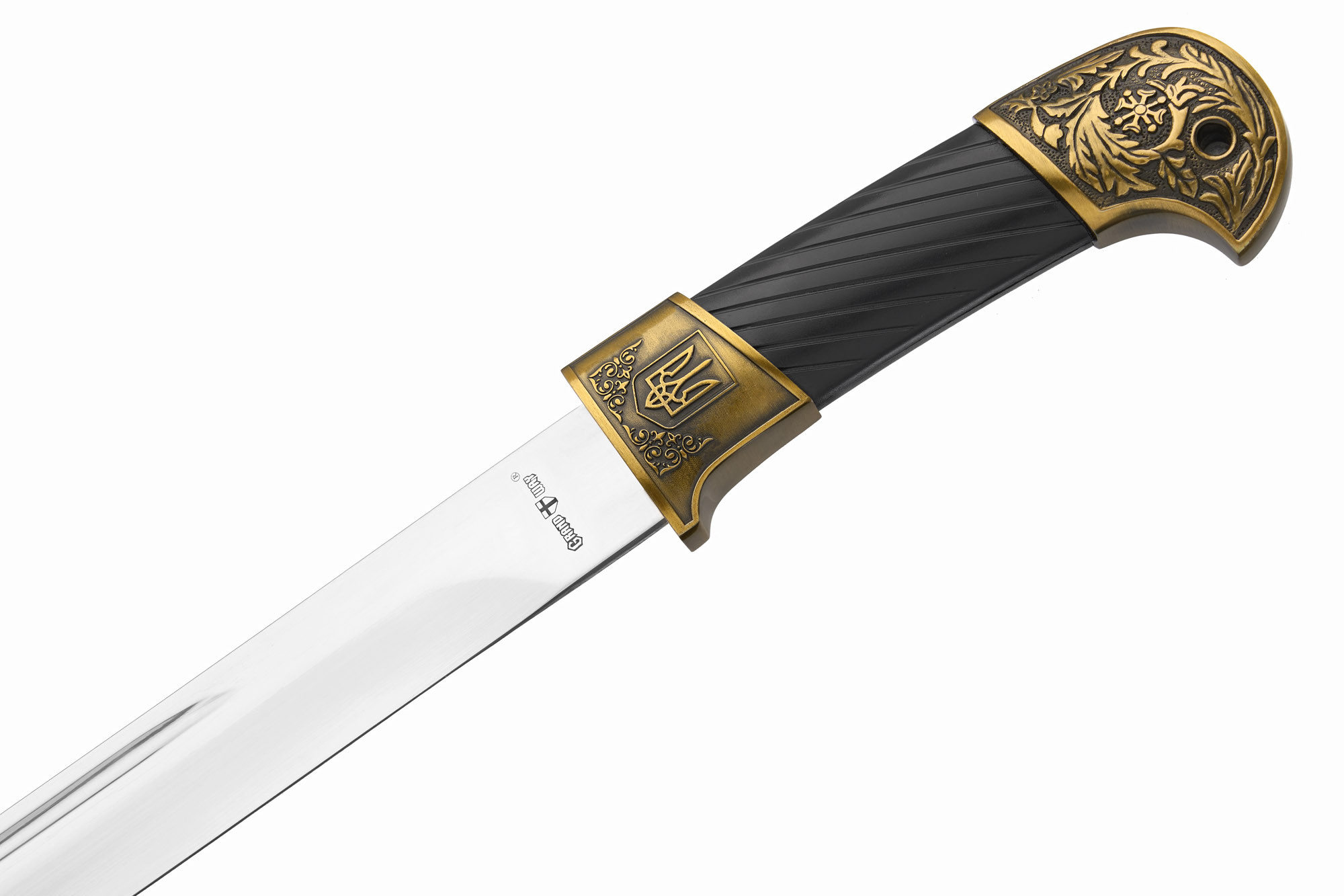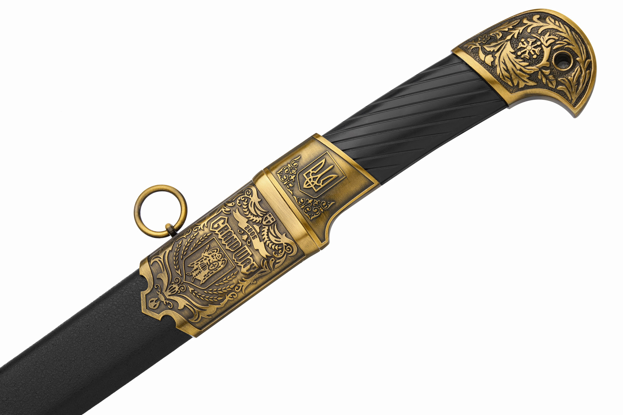 Особливий цікавим є оформлення ефесу, на який нанесено зображення малого герба України.