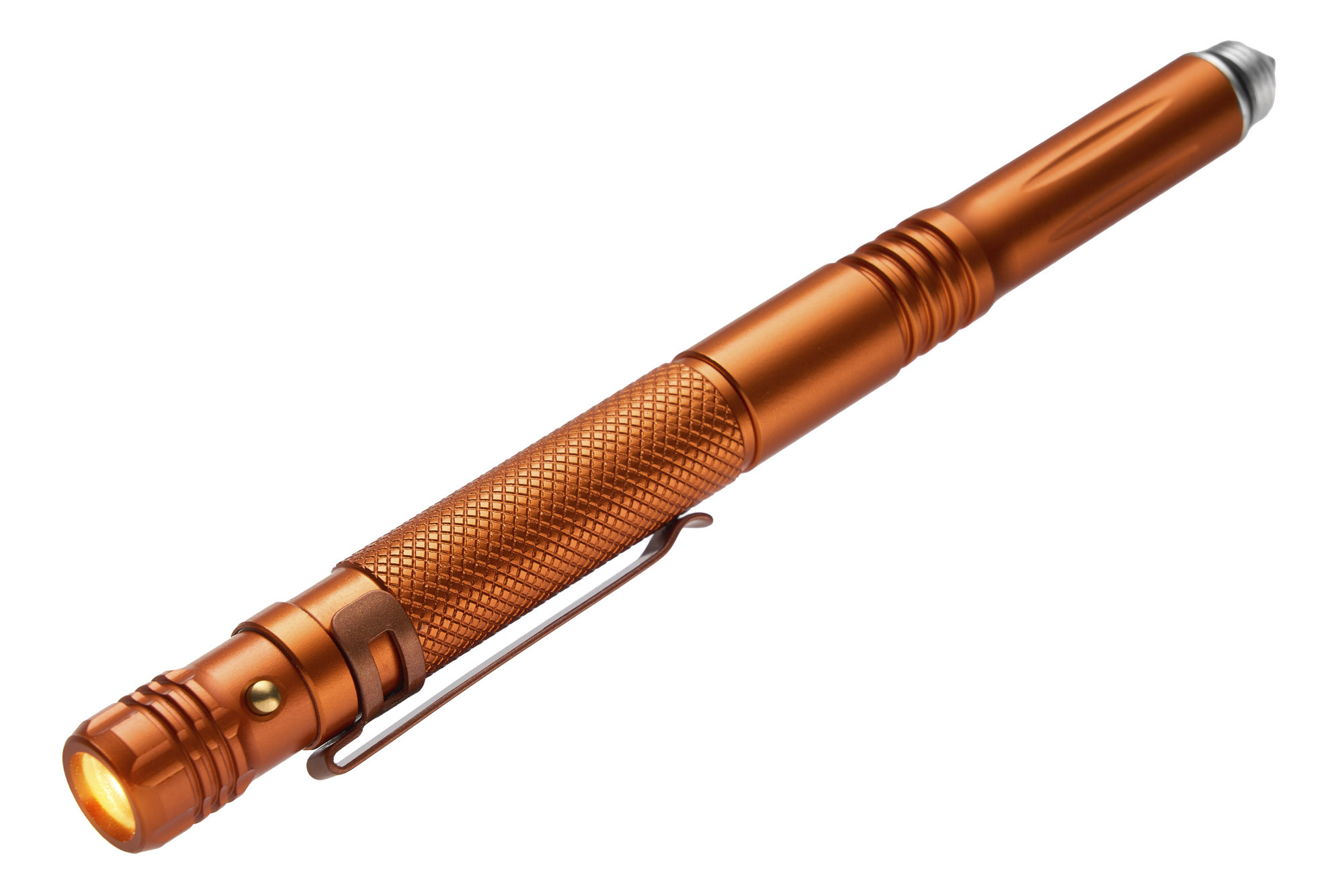 На тильній стороні ручки розташована низькопрофільна кліпса для зручного носіння на кишені або ремені, а також вбудований світлодіодний ліхтарик, який можна викрутити та використовувати окремо.