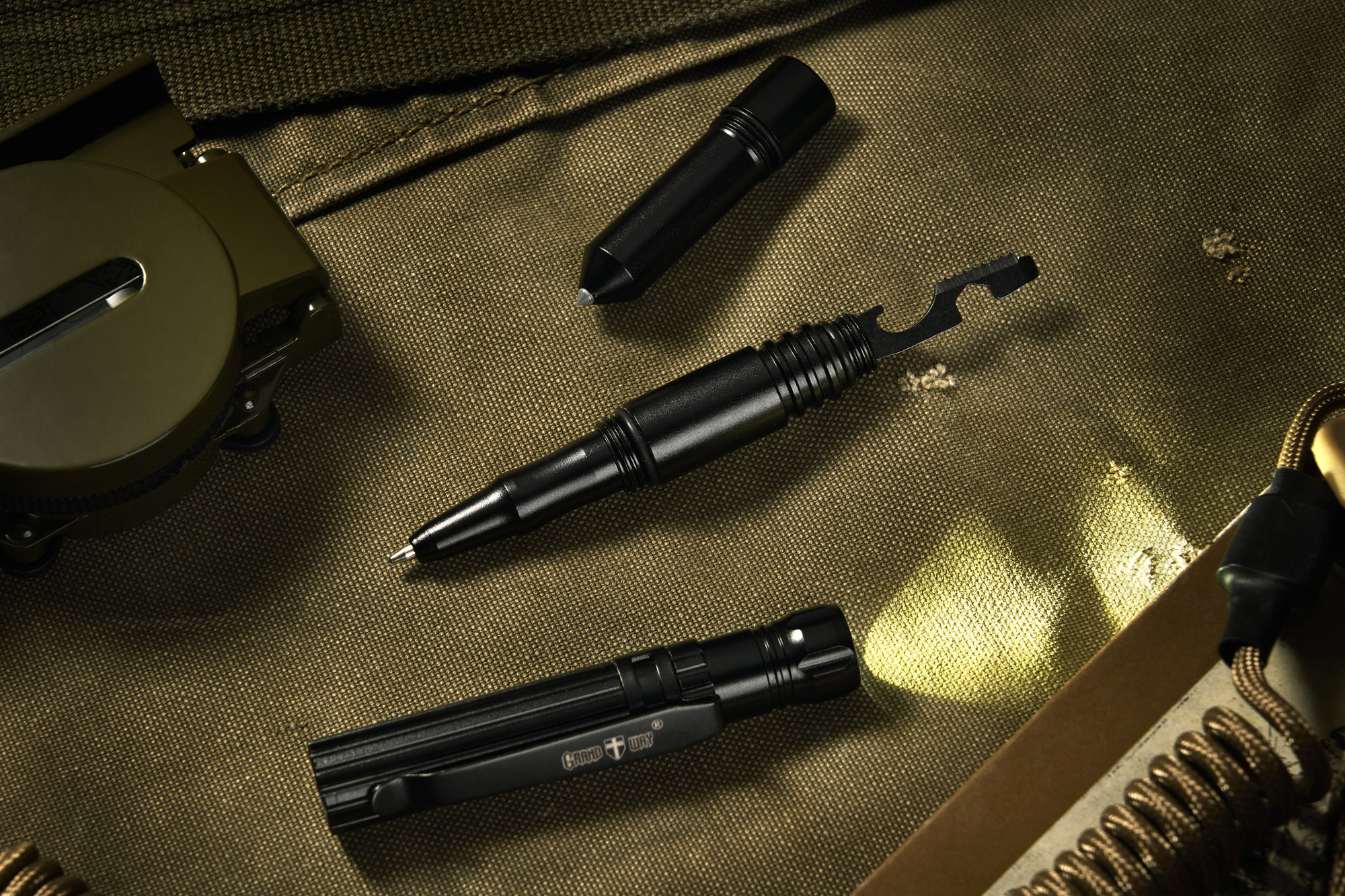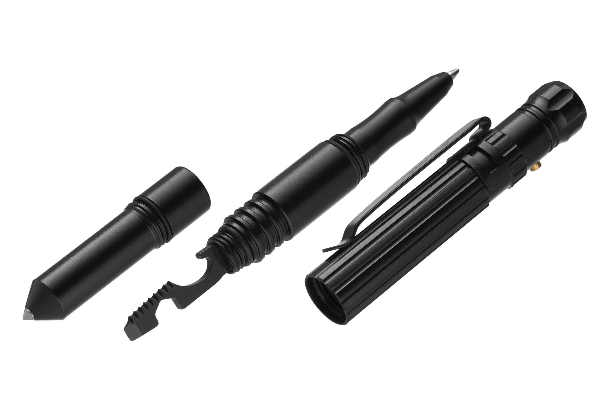 Корпус ручки виготовлений із легкого алюмінію, що робить її міцною та зручною для щоденного носіння. Розбірна конструкція перетворює ручку на компактний куботан: у зібраному вигляді вона виглядає як солідна кулькова ручка з ударним елементом на місці пишучого стрижня. Під знімним ударним елементом знаходиться сам пишучий стрижень — просто знімаєте і пишете.