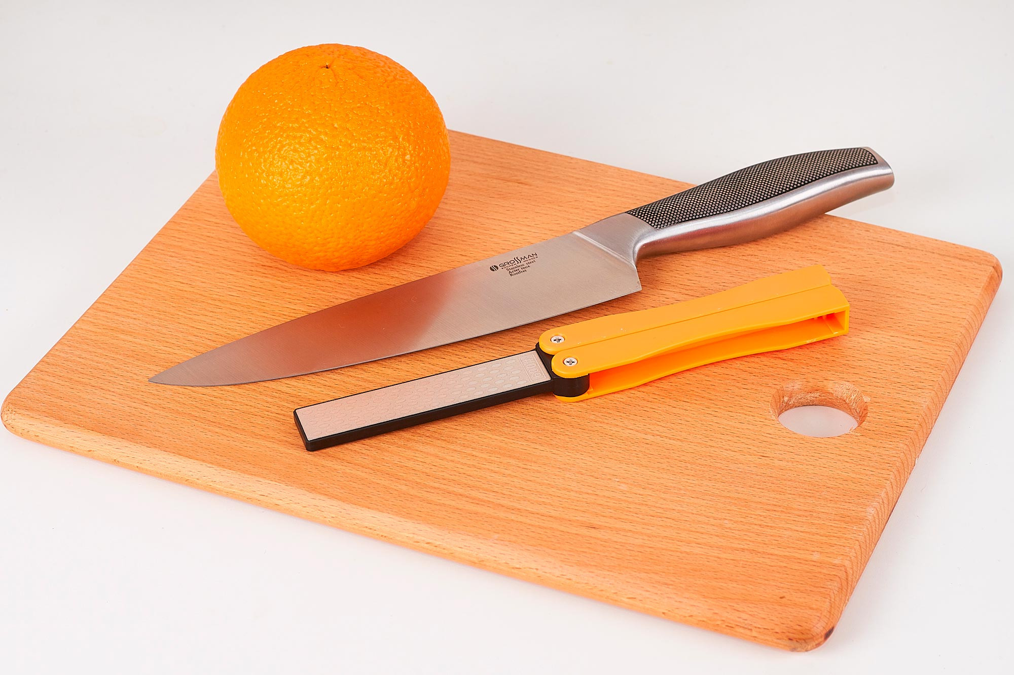 В пластиковом корпусе упрятан двухсторонний заточной элемент, покрытый гальваническим алмазным напылением. Сторона с зернистостью 360 грит предназначена для устранения крупных повреждений и формирования режущей кромки. Обратная сторона, с зернистостью 600 грит, предназначена для тонкой шлифовки режущей кромки ножа и периодической правки. Помимо ножей точилка идеально подойдет для заточки рыболовных крючков и прочих острых девайсов, которые необходимо затачивать на абразивной плоскости.