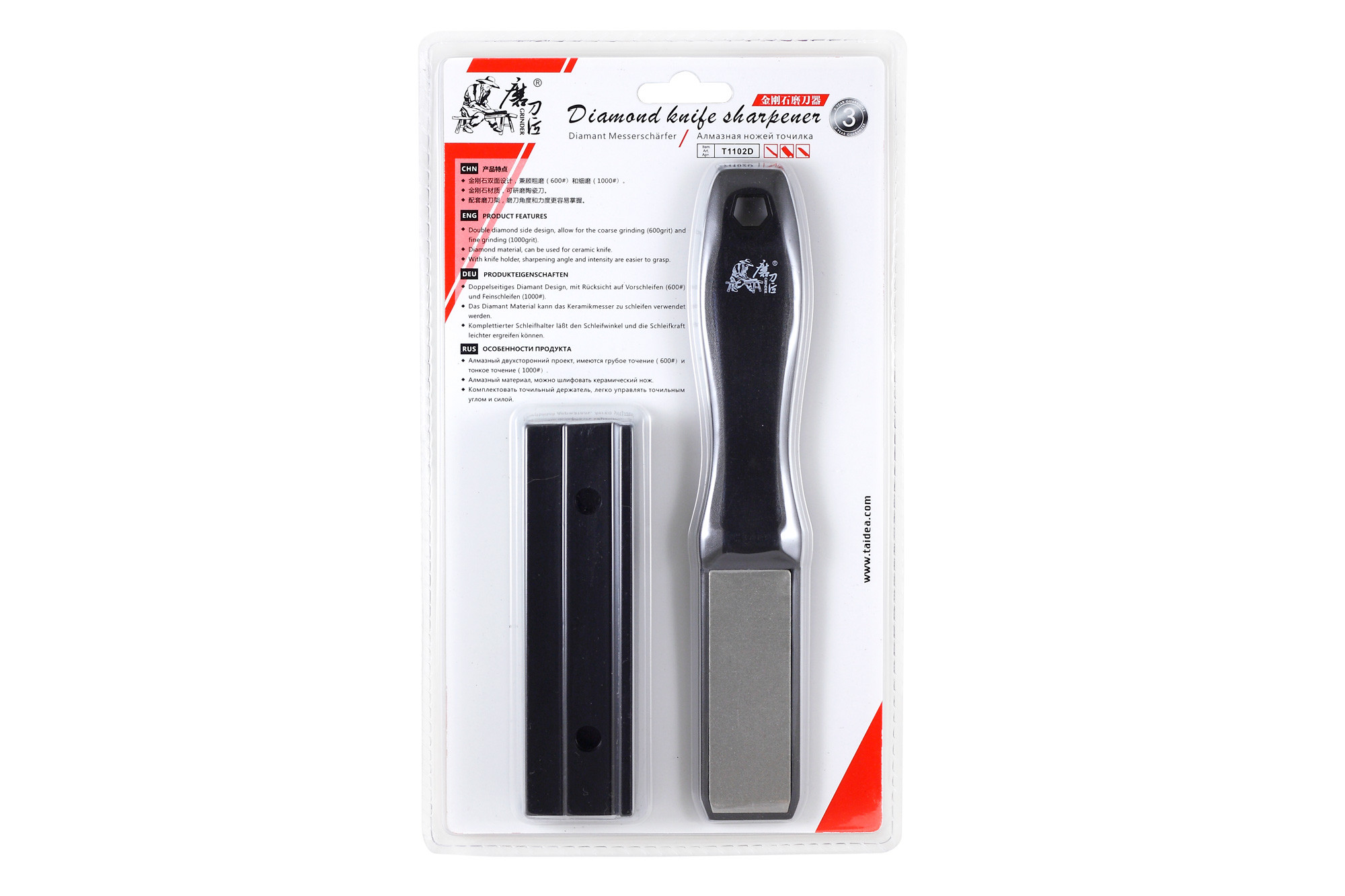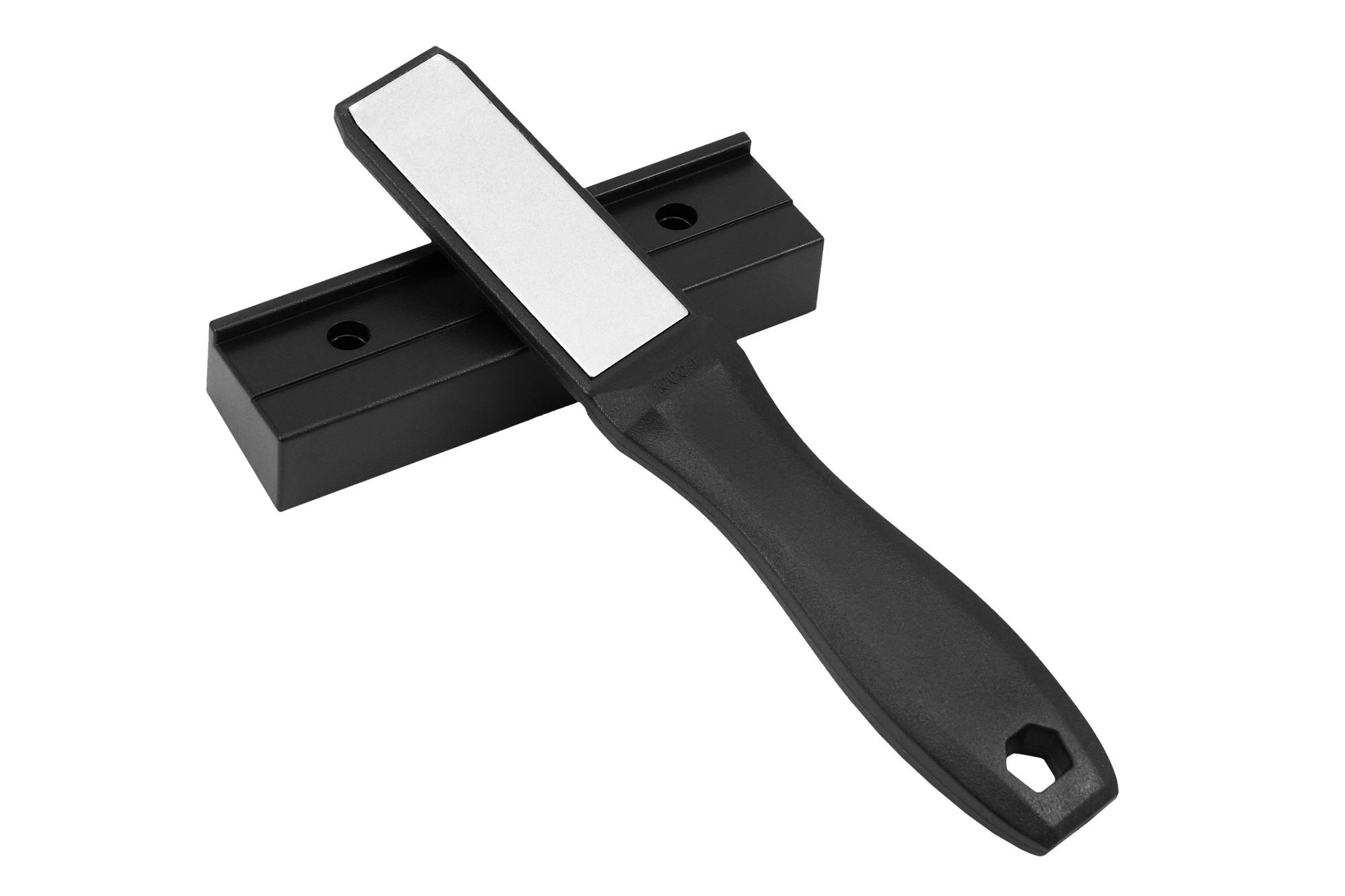 Комплект состоит из держателя ножа и собственно двусторонней точилки. На одной стороне устройства находится более грубый абразив зернистостью 600 грит. Он хорошо подойдёт для восстановления основательно притупившихся ножей. На другой стороне зернистость абразива составляет 1000 грит. Эта часть лучше подойдёт для окончательной доводки либо для подтачивания достаточно острых режущих кромок.
