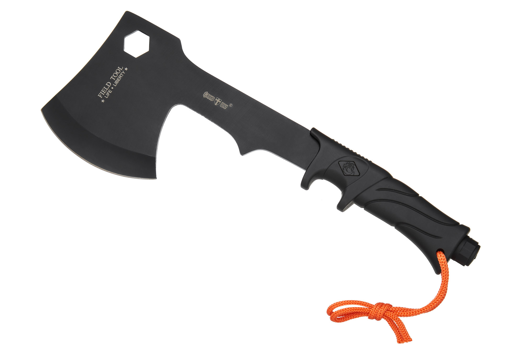 В окончании рукоятки сделано отверстие для закрепления темляка или страховочного шнура, которые предотвращают потерю топорика и облегчают работу при интенсивных работах.