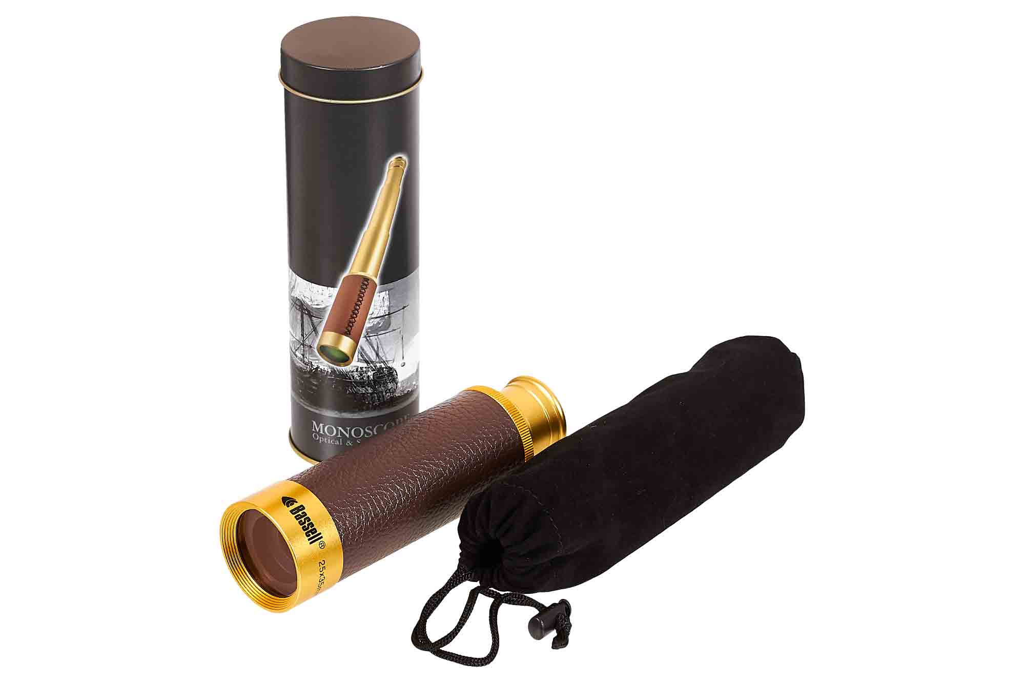 Зрительная труба поставляется в красивом жестяном футляре, вместе с чехлом из бархатистого материала и салфеткой для протирки линз.